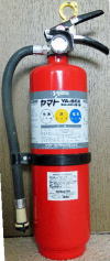 住宅用の粉末系(ABC)消火器は、A=普通火災・B=油火災・C=電気火災の火災全般に有効です。粉の色は主にピンク色の特殊なガスが練りこまれた粒子の細かい粉で、主成分はリン酸アンモニウムです。吸い込むと多少むせますが人畜無害です。