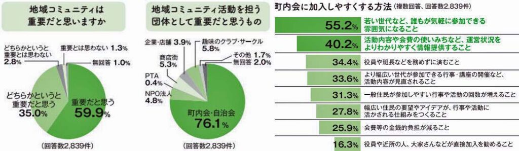 このアンケート結果で、地域コミュニティが「重要」だと思う人は94.9%、それを支える重要な担い手は町内会であると考える人が76.1%いました。重要だという思いを「町内会加入・参加」につなげるには、気軽に参加できる仕組みとわかりやすい情報伝達があれば効果的です。